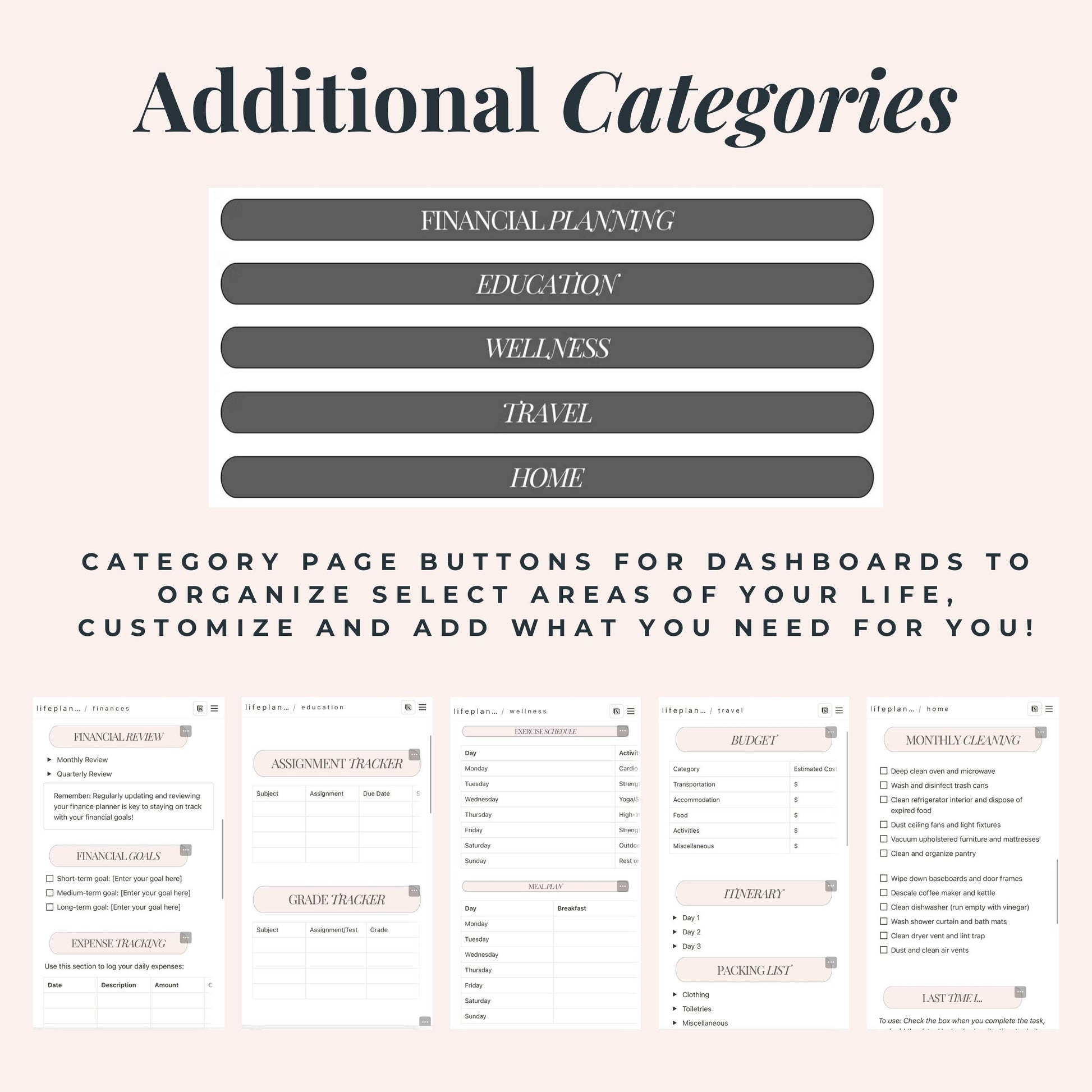 โข Education (note taking template, assignment tracker, grade tracker, important dates, study schedule, resources, goals)