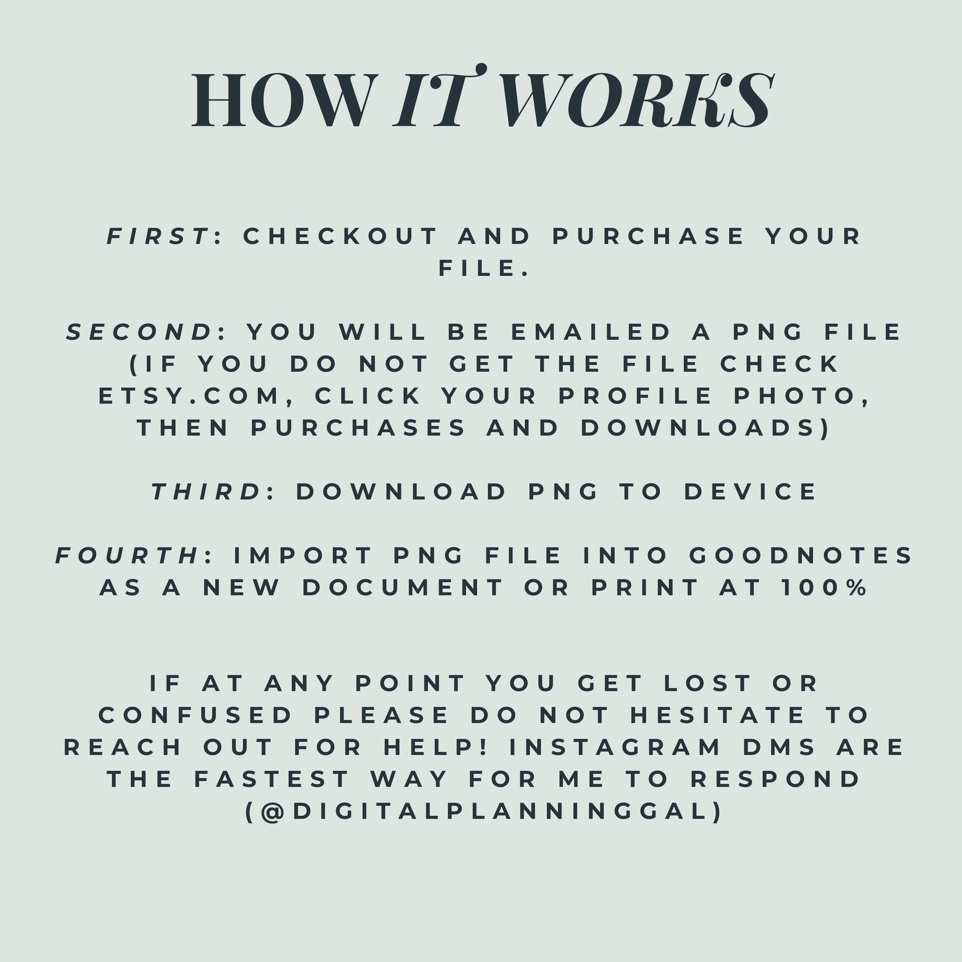 Downloadable file including PNG file . Open this file and click the button to download. Save to photos and import into apps like goodnotes or notability to write on using iPad or tablet. Print at 100% for a physical planner page.